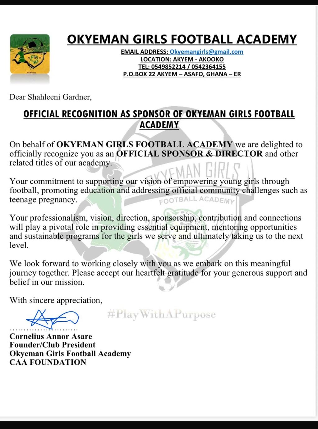 Okeyman Girls Football Academy was founded by Cornelius Annor Asare in 2023. It is located in Eastern Ghana, camping 42 girls aged 7-16 years of age.